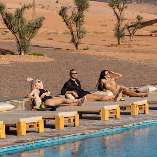 Nestled near the Agafay Desert, the camp is located on the other side of Agafay, 7km from the Lalla Takerkoust Dam. The landscape is stunningly desert-like, with breathtaking reliefs almost identical to those of Agafay. The camp blends luxury with authenticity, offering traditional Moroccan cuisine crafted from fresh, local ingredients.