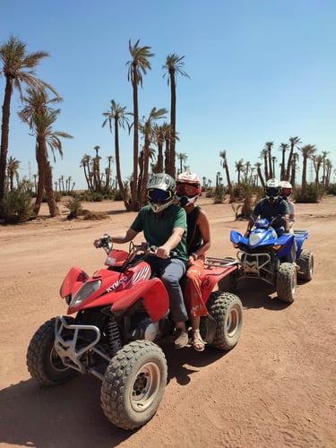 Experience the thrill of quad biking through the stunning Palm Grove. This exhilarating activity takes you on an adventure across vast palm tree plantations and rugged terrain, offering breathtaking views and a unique way to explore the natural beauty of the area. With expert guides leading the way, you'll navigate through diverse landscapes, making stops for photo opportunities and a refreshing tea break. Whether you're an adrenaline junkie or a nature lover, quad biking in the Palm Grove promises an unforgettable experience filled with excitement and discovery. Perfect for families, friends, and solo adventurers alike, this activity combines fun, adventure, and the chance to connect with Morocco's captivating outdoors. Book now for an unforgettable ride through the heart of the Palm Grove!