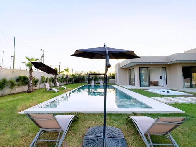 Outside, everything is set for pleasure and relaxation: two private swimming pools, a jacuzzi, a shaded pergola, and a beautiful garden designed for calm and enjoyment. Sun loungers and outdoor seating areas create the perfect setting for daytime relaxation or sunset moments, while the barbecue area is ideal for friendly evenings with family and friends.