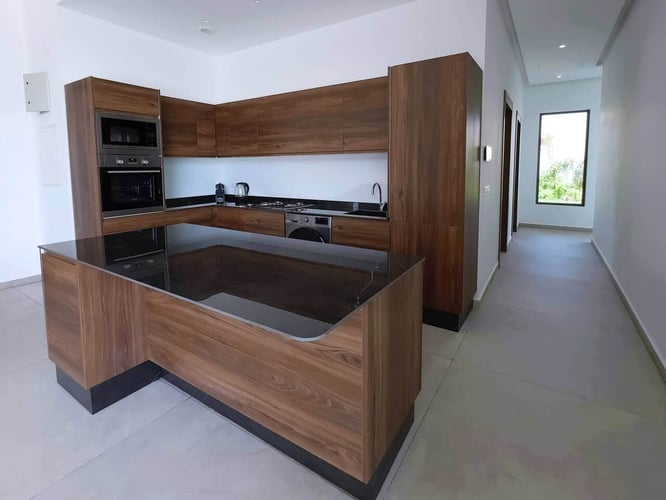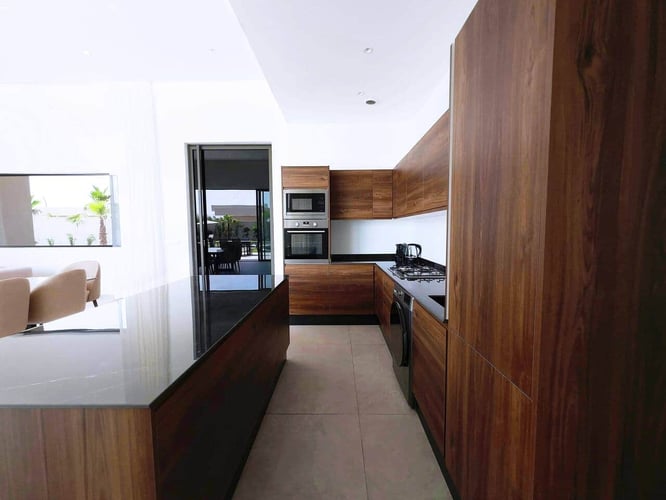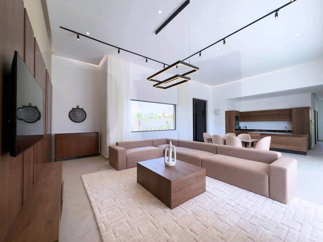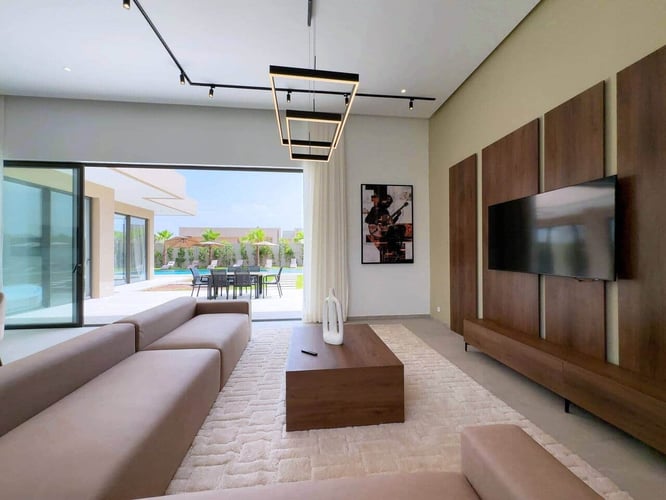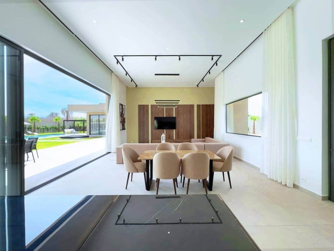The villa is designed as two fully independent living units, each with its own private entrance, giving you maximum flexibility and total privacy. Inside, you’ll find two spacious living rooms with large glass doors, natural light, and direct views of the pools—ideal for relaxing or hosting in a chic and cozy setting. The property also includes two modern fully equipped kitchens with high-quality materials and plenty of storage, allowing each unit to operate independently.