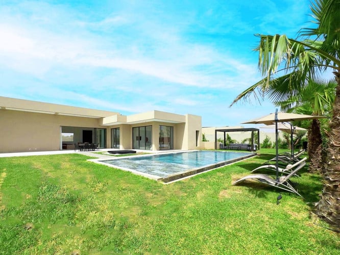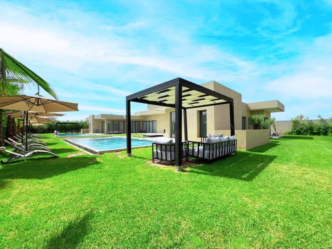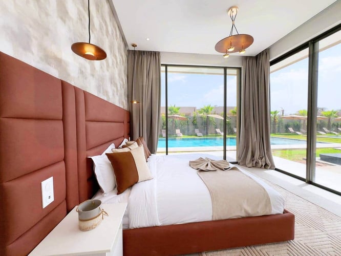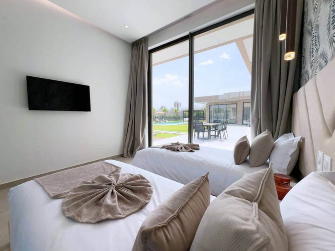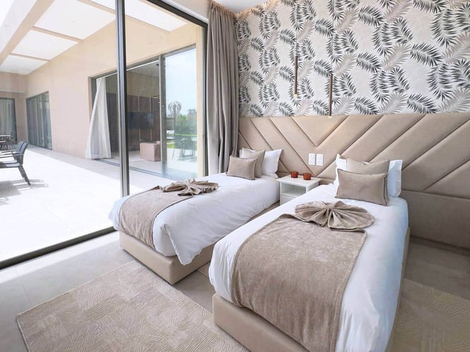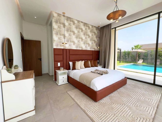 Villa Coral is a rare and high-end twin villa located on the prestigious Route de Fès, just 15 minutes from the center of Marrakech, inside a secure private residence. Built on a fully enclosed 2,000 m² plot with no overlooking, it offers a calm atmosphere, modern comfort, and premium finishes—perfect for large families or groups looking for space and privacy.
