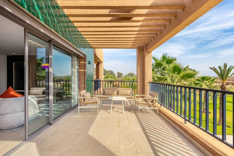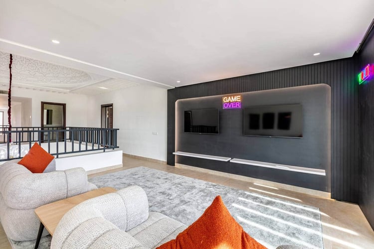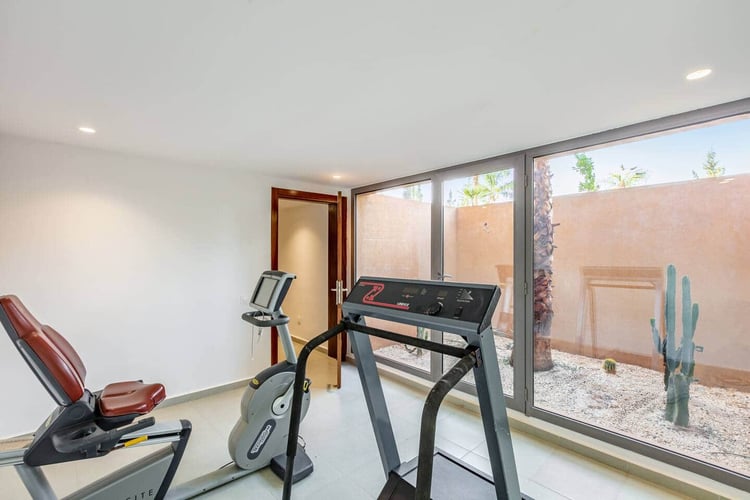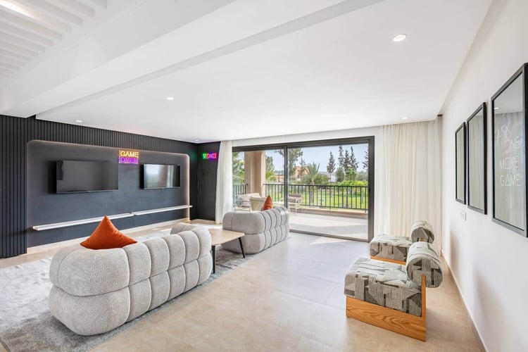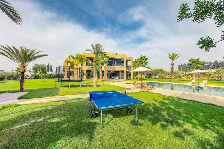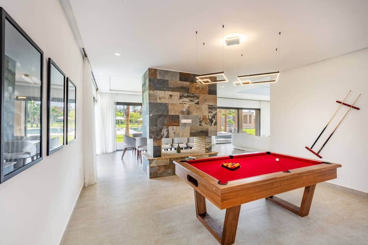 Outdoors, the property offers a large private swimming pool measuring 15 × 9 meters with no overlooking, surrounded by nature and open views of the Atlas. Dedicated wellness and leisure spaces complete the experience, making the villa a true retreat just outside Marrakech.