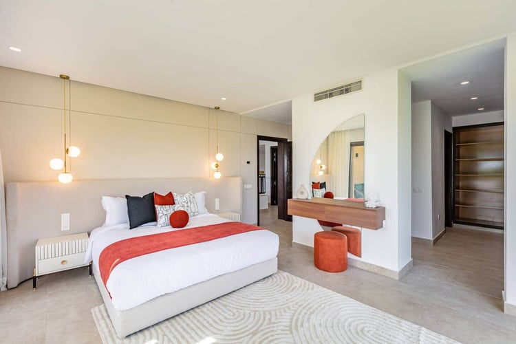 The villa features five elegant suites, including one on the ground floor and four on the upper level. Each suite has its own modern bathroom and private terrace. The sleeping configuration includes three king-size beds and four single beds, offering flexibility and comfort for all guests. Bright living areas and a fully equipped kitchen create a warm and refined atmosphere, perfect for shared moments.